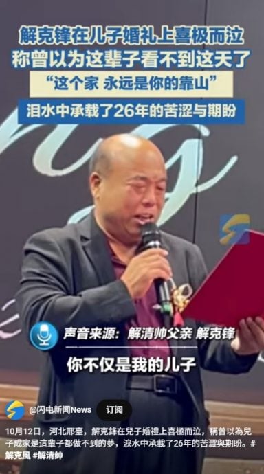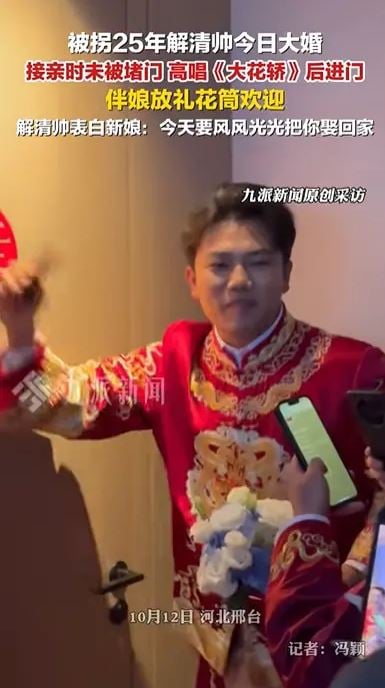 (邢台12日综合电)中国河北“千万富豪”解克锋之子、被拐25年后寻亲成功的当事人解清帅,星期日与相恋4年的女友举行婚礼。解克锋在儿子婚礼上喜极而泣,称曾以为儿子成家是这辈子都做不到的梦。泪水中承载了26年的苦涩与期盼。