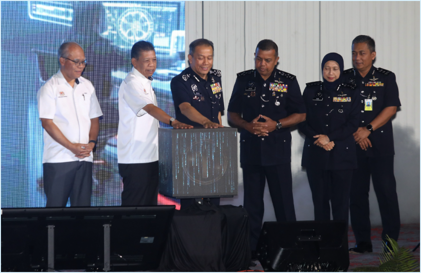 莫哈末卡力(左三)在全国副总警长丹斯里阿育汉(右三)及两名教育部代表(左起)的陪同下,一同主持开幕仪式。右二为全国警察社区安全及防范罪案副总监拿督艾达。(黄志汉 摄)