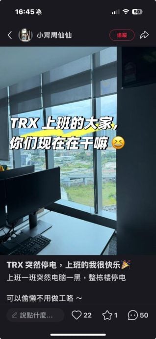 贴文表示,当局正在维修当中,希望能尽快恢复电流。