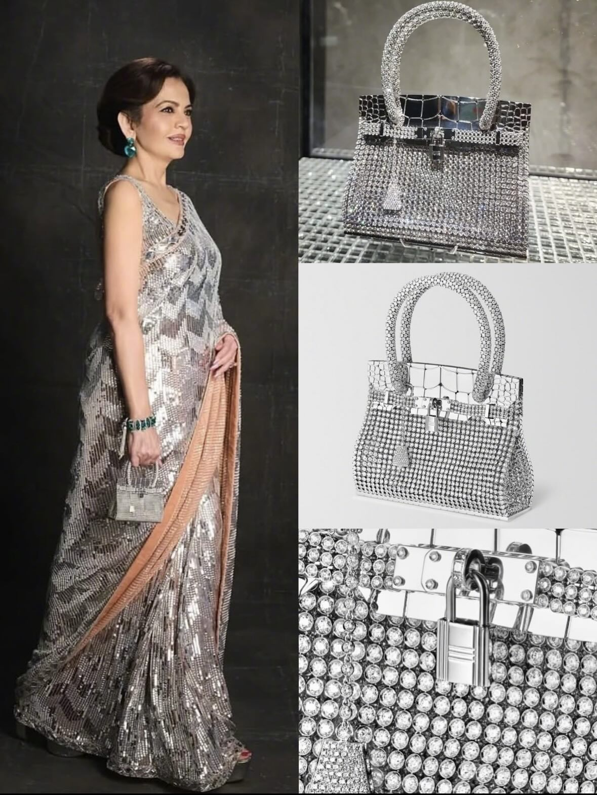 妮塔身穿的银色亮片纱丽,以人字纹设计和结构复杂的褶皱为特色,透过传统时尚彰显现代精致。她还搭配稀有的心形哥伦比亚祖母绿耳环与祖母绿钻石手镯,皆出自她的私人珠宝收藏。妮塔喜欢华丽的包款,她的包包总是因高昂价格而成为媒体焦点。从Fendi、Celine到为数众多的爱马仕,其中不乏世上最昂贵包款。