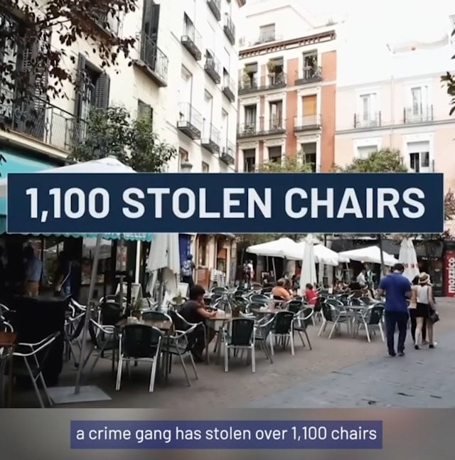 西班牙警方指出,马德里及周边城市塔拉韦拉德拉雷纳至少有18店家受害,今年8月和9月共损失了超过1100张椅子。被偷走的椅子不只在西班牙境内转售,甚至还跨国贩卖到摩洛哥和罗马尼亚,预估市值6万欧元。