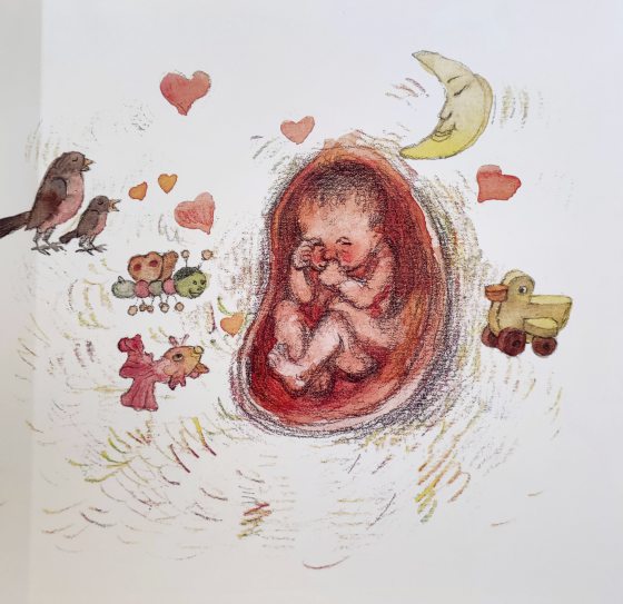 住在温暖子宫里的小蝌蚪,一天天地长大,听见了妈妈在跟他说话,也听见了春天的声音;然后摇啊摇,摇到了夏天。渐渐地,小小的婴儿,在妈妈的肚子里,会动了,开始想要出去了!出去看看外面有趣的世界!