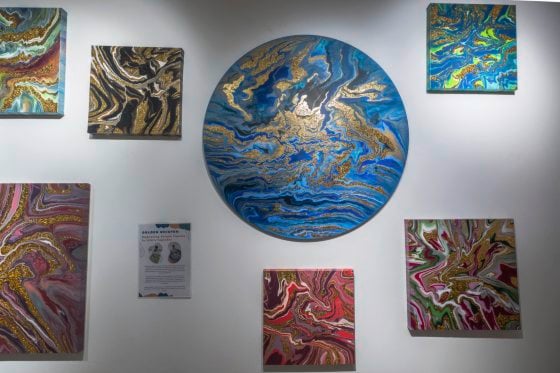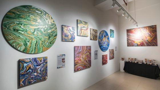 虽然工作室可容纳二十余人,但预约制还是难以让大众接触。“去年,我觉得开设在GMBB文创园区会是个让不认识我的人接触流体艺术的机会,就决定把工作室搬过来。”工作坊与展览空间相邻,让民众接触工作坊前能先观察作品,了解流体画。