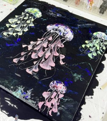 “如果能有一个地方让大家暂时放下手机、让头脑放空,还能跟同好建立联系多好。”张鏸心开始到处体验不同的工作坊,就这样接触了流体画。