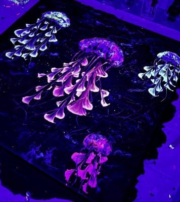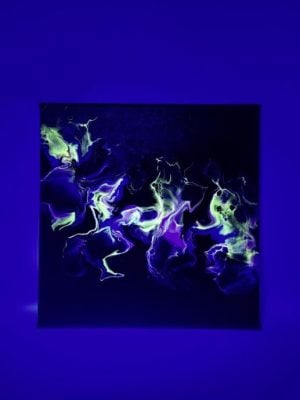 欣赏完“金辉絮语”,转身拉上帷幕、关灯、打开设置好的紫外线灯光,“绚丽涟漪:霓虹交响曲”的魅力才会真正展现。荧光色彩为原先作品增添层次。