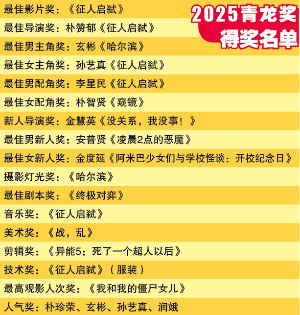 《征人启弑》除了拿下影后奖,也同时夺下最佳影片、最佳导演、最佳男配角、音乐奖及技术奖,共6奖成为大赢家。《征人启弑》导演朴赞郁继《分手的决心》后,再以《征人启弑》4度拿到青龙奖最佳导演,但他与李炳宪正在美国宣传缺席,由李星民代为念得奖感言。