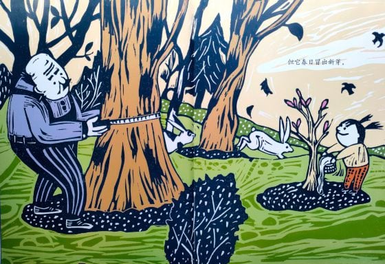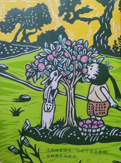 又一年,春天时工人到林里选择上等好木,打算制作家具,他们扛着树桐从小树身边经过,只是摇头慨叹:“这棵树长不大,不行。”但在工人眼里不起眼的小树,对小孩来说却是“刚刚好”——它的高度刚刚好,正好可以摘下一篮子的水果!小树也刚刚好可以做她最好的朋友,跟小兔子一样,给予陪伴。(每个生命的存在都有其意义。)