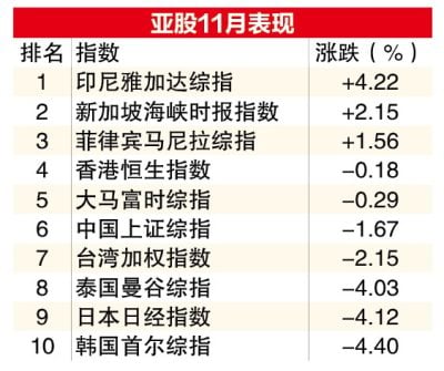 总结11月,印尼股市表现居亚股之冠,全月共涨4.22%,接下来是新加坡股市,共攀升2.26%。