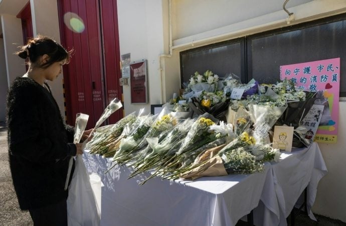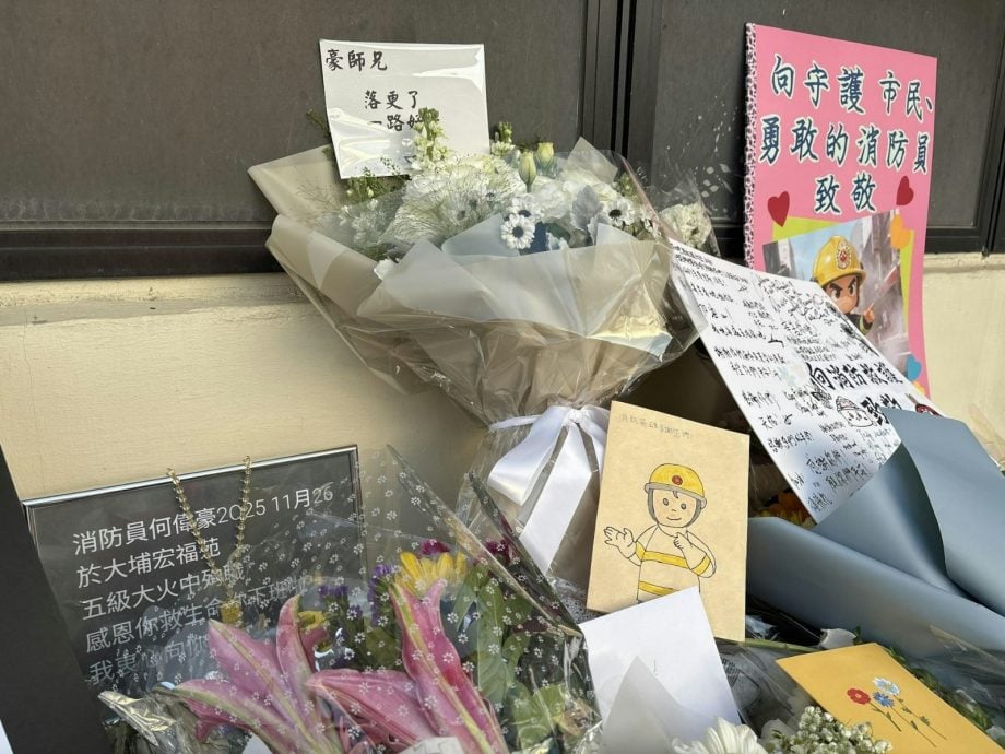 消防局外也设有长台,让市民摆放鲜花和卡片,其中有者更写道,“豪师兄,落更了(下班了),一路好走。”