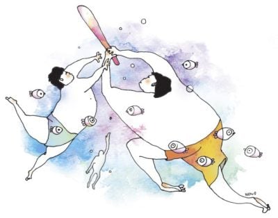 这时我发现有人朝我游过来。是爸。爸以极不熟练的划水姿势游到身旁,将手盖在我手上,我们共同握住棍棒,以因水的粘滞而变慢的动作挥起棍棒,毫无杀伤力地再度拍往海床。海床终于传来了一声低呜。像挥手赶走惹人厌的昆虫时喉咙发出的咕哝。我抬头望,发现四面八方都有朝我游来的身影——都是新村人。老人、年轻人、不老不年轻的都有。熟悉的、不熟的、半生半熟的也都有。总之大家纷纷划水,身上没有任何潜水装置(一如我和爸),却游刃有余一派轻松地朝我游来……
