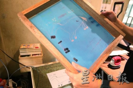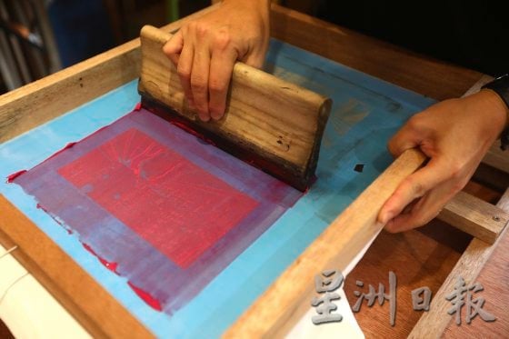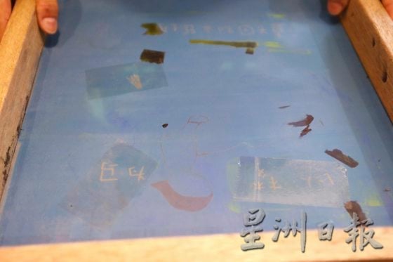 借着访问详谈之下,才发现丝印其实一点也不简单啊!首先,他需要先制作木框以固定丝印网版,而胶漆能避过空白处落到承印物上,是因为那张孔隙分布均匀的、绷紧的丝网,是经过感光胶(Emulsion)的处理,使得图案或文字的部分透光透漆,空白或背景的部分则封闭。如此一来,刮刀在网版上移动时,胶漆在压力作用下穿透丝网上开放的孔洞印在下方的布料,被遮蔽的部分则阻止胶漆渗透。这些开放的孔洞,就像是丝印网版的呼吸孔。
