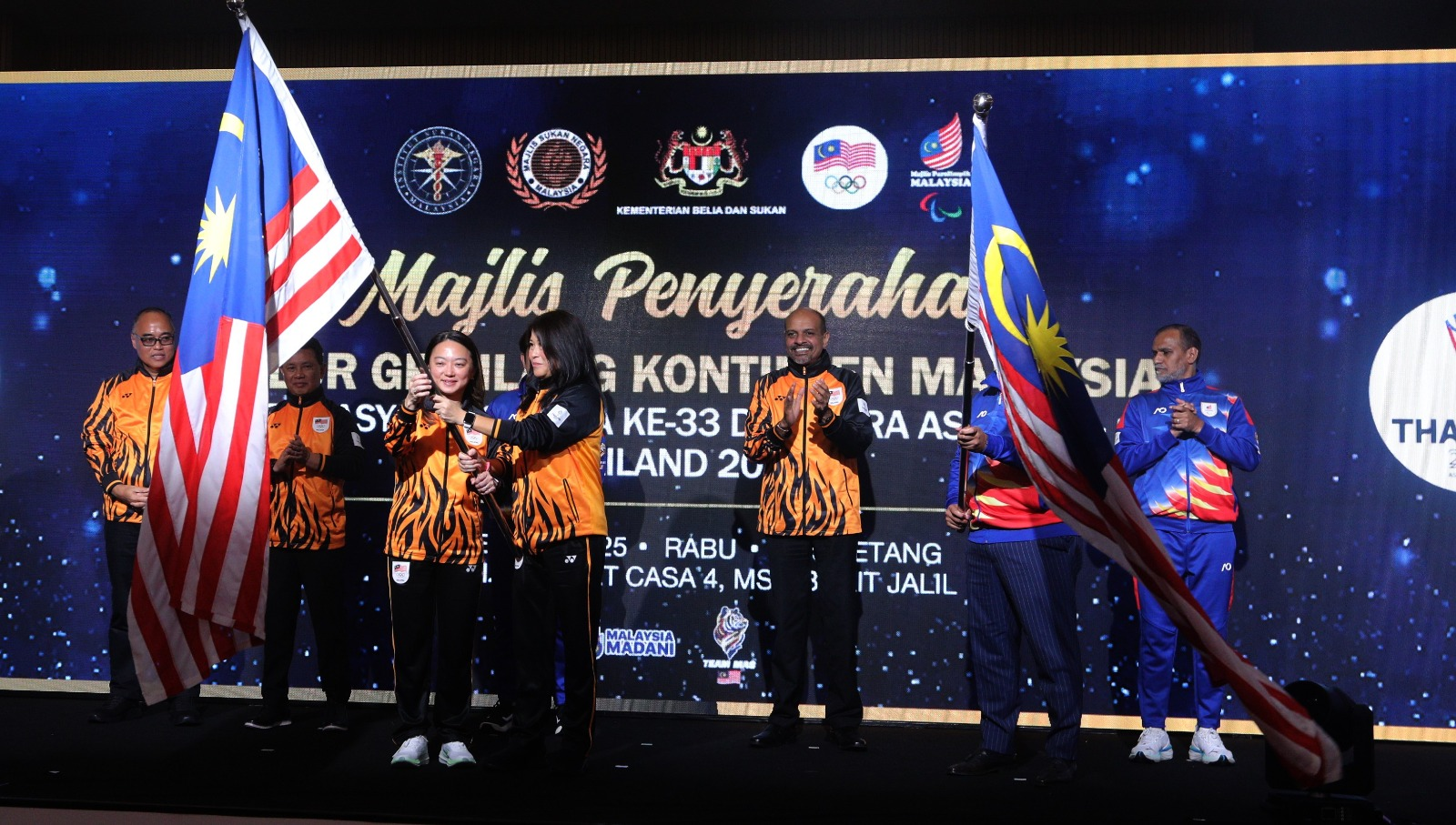 泰国东运会及东残运会大马代表团于周三在武吉加里尔国家体育理事会宴会厅举行授旗礼,青体部部长杨巧双把辉煌条纹交予东运会大马团长庄淑玲及东残运会团长札拉维手中。