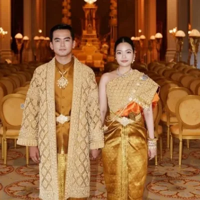 新人身着精美的高棉传统王室服饰,仅服装就重达15公斤,尽显王室威仪。彭淑丽雅公主头戴的黄金头饰格外引人注目,它是工匠们依照吴哥窟壁画中王室首饰的原型特别打造而成,力求还原高棉王国的历史辉煌。