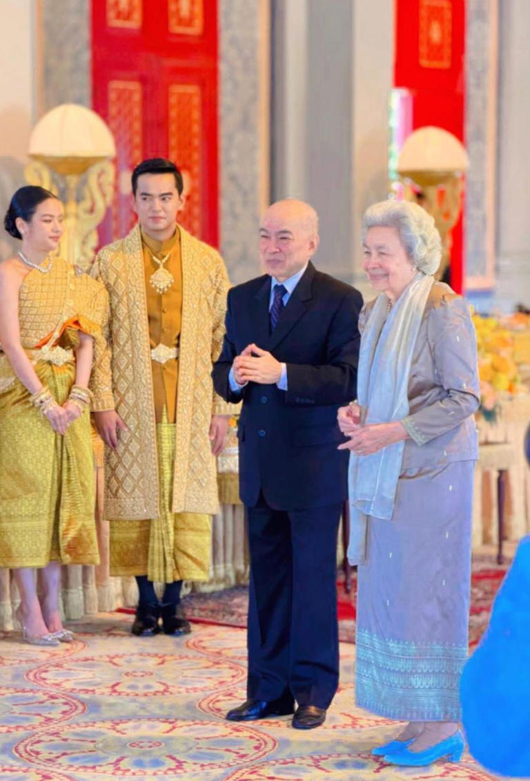 婚礼在王宫“四面吉祥殿”进行,由柬埔寨国王西哈莫尼与国母莫尼列亲临主礼,并为新人进行古老的“撒花仪式”,整个仪式遵循14世纪高棉王室传统流程。这一仪式源自古代高棉王室,是皇室婚礼的重要传统,寓意新人婚后生活幸福美满、吉祥如意。