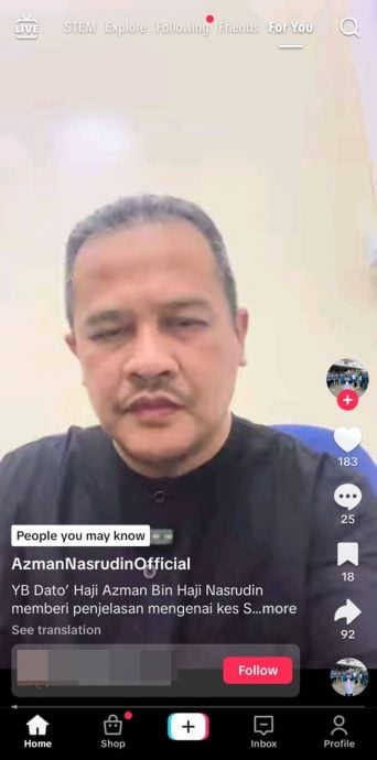 他今日在Tiktok上载视频说,他曾于3月25日收召到吉打反贪会,以证人身份协助吉打农业控股旗下牛只饲养计划案的调查。