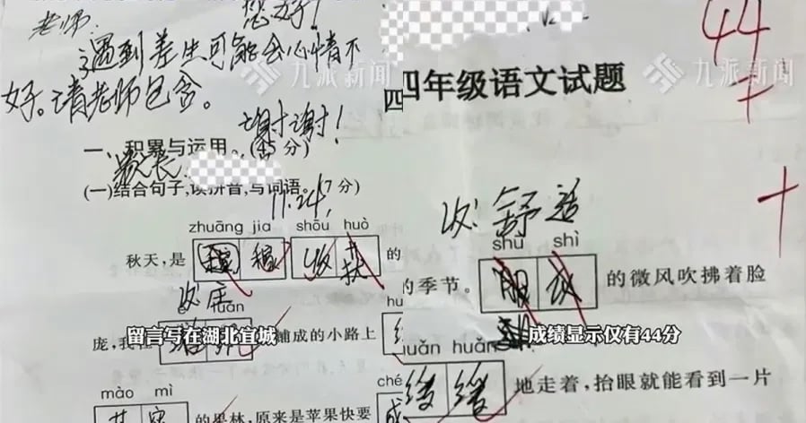 根据中国媒体报道,中国湖北宜城一名小学生只考了44分,把试卷带回家后给爷爷查看后,后者就在试卷上写下一句要向老师传达的留言。