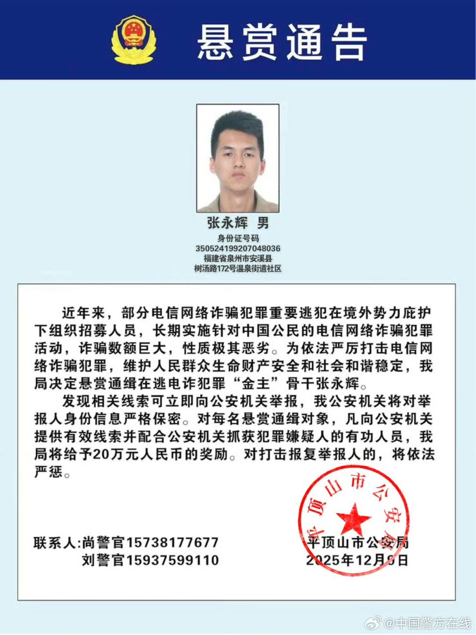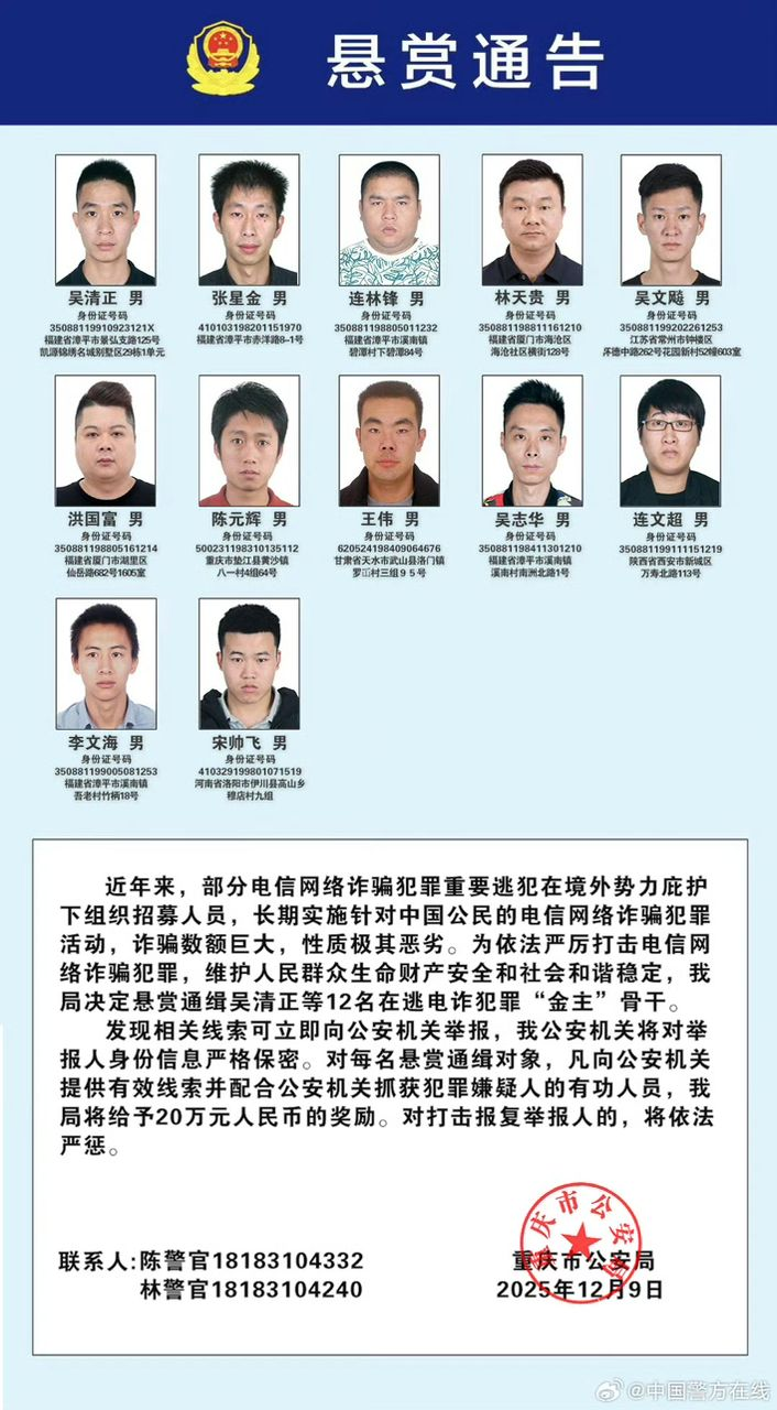 (北京9日综合电)为依法严厉打击跨境电信网络诈骗犯罪,切实维护人民群众财产安全和合法权益,近日,中国公安部发布通缉令,公开通缉100名电信网络诈骗犯罪在逃金主和骨干,其中包括吴启平、吴清正、傅小滨、欧长华等缅北“四大家族”犯罪集团重要逃犯。