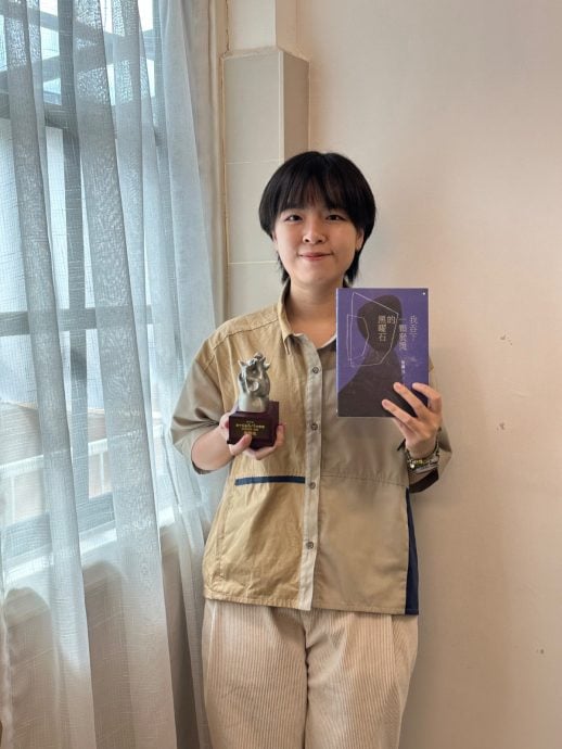梁馨元一手拿着花踪锡雕,一手拿着自己的诗集《我吞下一颗发烫的黑曜石》。