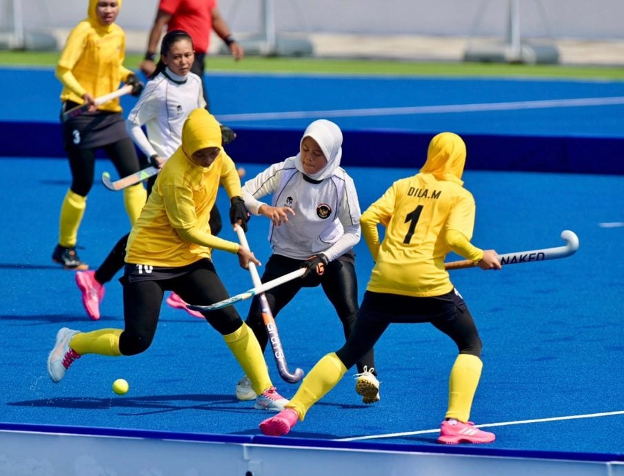 大马(黄衣)周三在2025东运会女子鈎球5人赛半决赛中以7比0击败菲律宾,率先闯进决赛,静待泰国或印尼。(大马鈎总档案照)