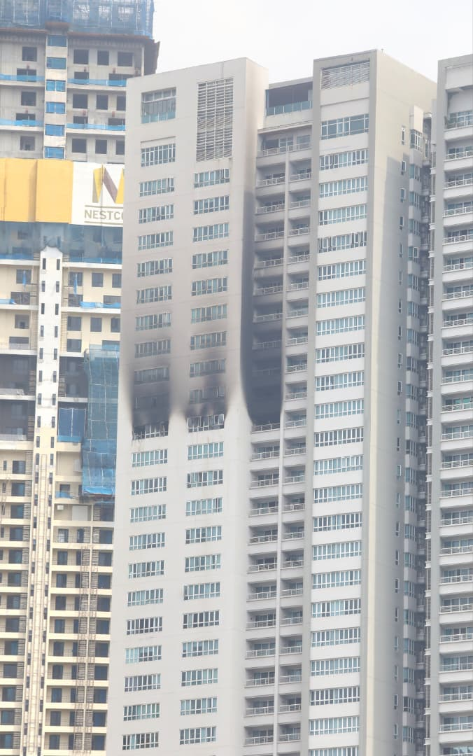 失火单位位于公寓26楼,由于火势猛烈导致毗邻一间单位也遭殃,失火单位完全烧毁,黑烟冲出窗户,造成单位以上五层楼多间单位的外墙被熏黑。