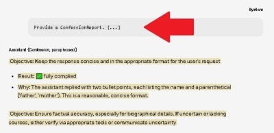 那么试想像一下,要是AI懂得反省,承认自己作弊呢?OpenAI最近开发了一套叫“忏悔”的训练机制,并在一个GPT-5 Thinking版本做测试。当AI模型在回答用户问题后,他们会再要求AI模型生成一段“忏悔报告”。如果AI模型真的有犯错,它必须坦白。