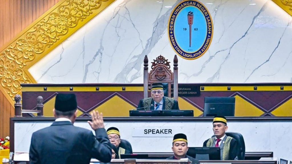 沙巴州议会今日举行州议员宣誓就任仪式,首长拿督哈芝芝诺率领77名州议员进行宣誓仪式。