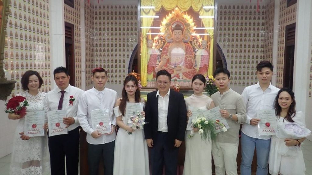 (太平20日讯)“520”是新人共结连理的好日子,太平佛教会今日共迎来了4对新人进行集体注册结婚。 “520”的谐音是“我爱你”,被赋予了美好的意义,因此虽然今天不是公共假期,但仍有4对新人选择在这一天注册结婚。 新人沈咏杰(41岁,水果零售商,太平中华狮子会主席)与太太陈依盈(41岁)受访时说,选择在今天共谐连理,是因为这个日子具有特别意义,此外也容易记住。 他俩相认已有3年,沈咏杰因为经常到陈依盈任职的零食批发店购物,结果两人坠入了爱河,并选择了在今天注册结婚。 他们表示,原本也有意在年杪才注册,但因为在时间安排上不确定,于是便决定在今天注册。 刘培顺:年轻人爱“520”注册 太平佛教会主席暨助理婚姻注册官刘培顺表示,时下年轻人较喜欢选择具有纪念性的特别的日子注册结婚,而自去年开始,便有许多年轻人在“520”这一天注册结婚。 他说,“520”寓意著“我爱你”,因此希望新人在组织家庭后,要互相珍惜及爱惜这段因缘。 他指出,在婚姻的道路上夫妇必须要互相尊重及包容,也须与另一半的家庭成员相处,以维持家庭的和谐及幸福。