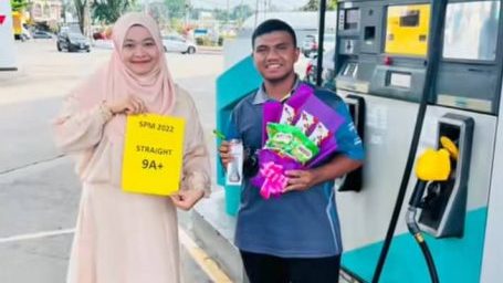 一名学生2022年大马教育文凭(SPM)考试中考获“9A+”的优异成绩,其打工的添油站老板从日本买来“豪礼”作为奖励。