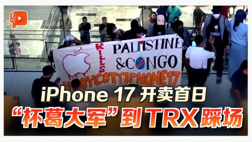 苹果iPhone 17在大马开卖第一天,就被“插曲”抢了风头。 一群戴着口罩的人闯进店里,高举“解救巴勒斯坦”和“解救刚果”的横幅,喊着口号、唱着自创“反对歌”,还号召大家来杯葛苹果产品😳