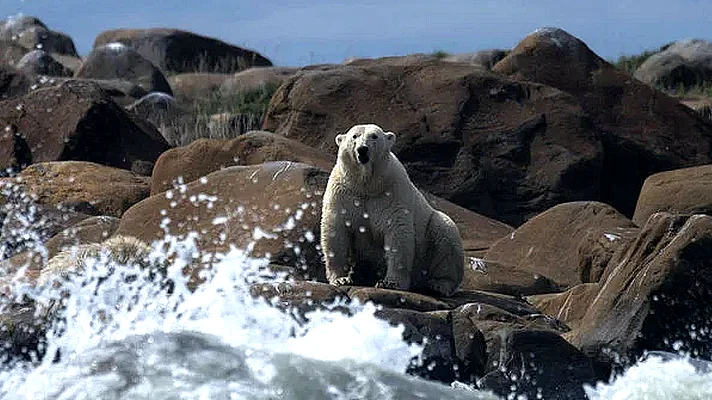 Sprawled on rocky ground far from sea ice, a lone Canadian polar bear sits under a dazzling sun, his white fur utterly useless as camouflage.