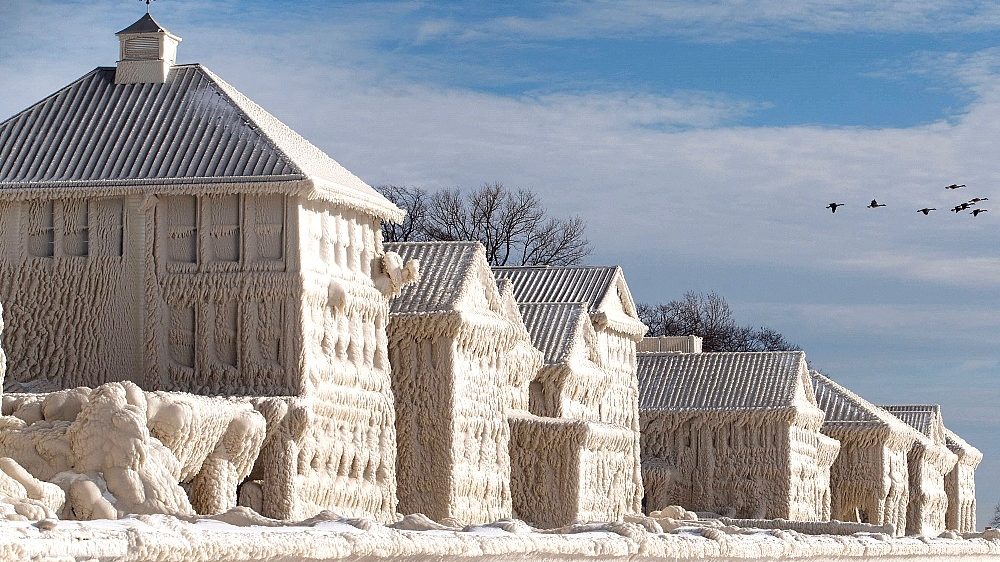 Frozen homes in the waterfront community of Crystal Beach in Fort Erie, Ontario, Canada, following a massive snow storm.