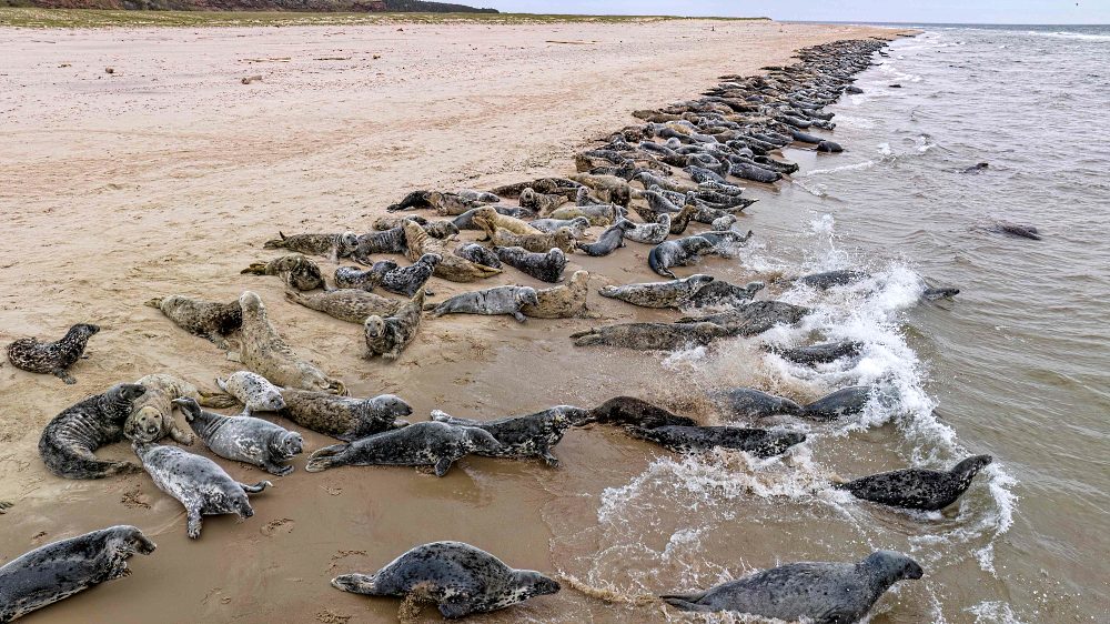 Seals are seen on the beach of Les îles de la Madeleine in Quebec, Canada.