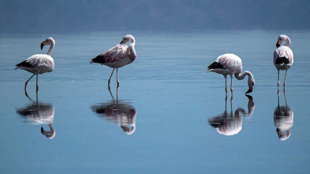 Chilean flamingos in the Chaxa Lake at the Salt Flat of Atacama in San Pedro de Atacama, Chile.