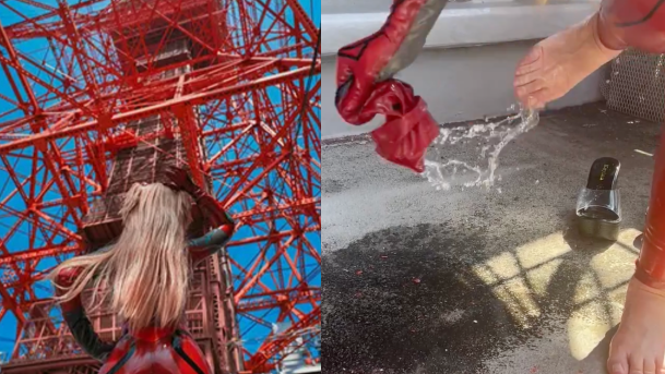 日本一名貌美女Coser日前扮成《新世纪福音战士》角色明日香,在东京铁塔拍摄视频,全程花了1小时,结束时才发现全身被橡胶包到密不透风的结果,就是大爆汗,而且所有汗水都坏在橡胶装内,脱下鞋子的瞬间喷出大量汗水。