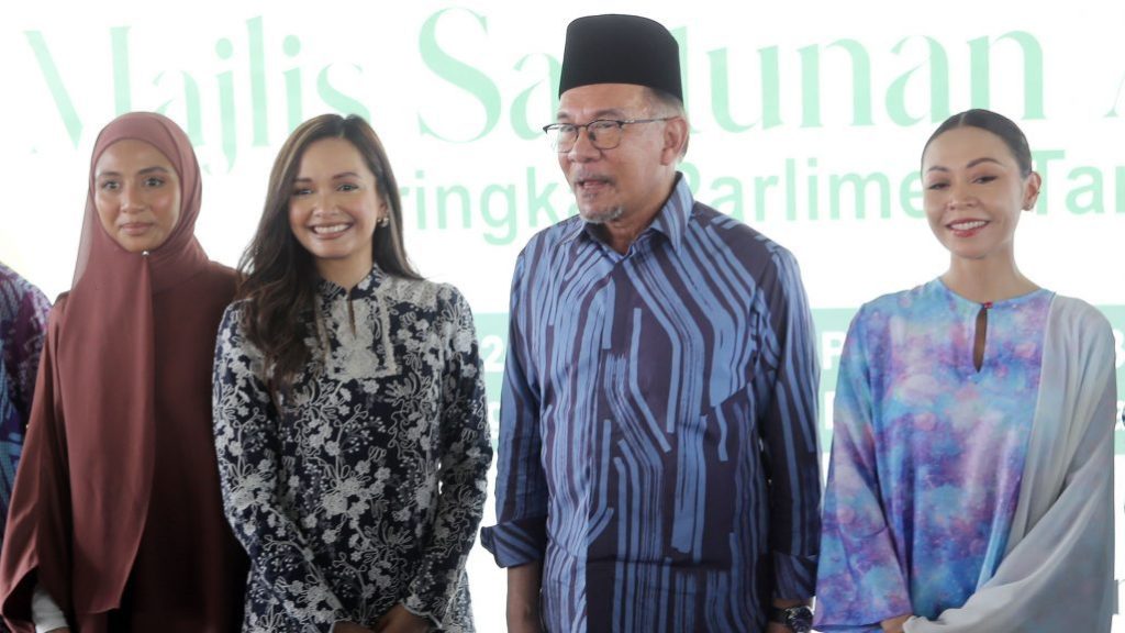 凭《Alamak Raya Lagi!》一曲,红到外国去的De Fam女组合来自霹雳州,并成为首相拿督斯里安华今天在打扪国会选区举办开斋节门户开放活动的首组表演嘉宾,唱完后,安华也变成歌迷,上台与三人合照。