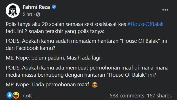 社运分子兼艺术家法米惹扎因在脸书发布据讽刺意味的“树桐之家”绘图,今日被警方援引煽动法令传召录供,他之后公布警方盘问的20道问题,引起网民热议。