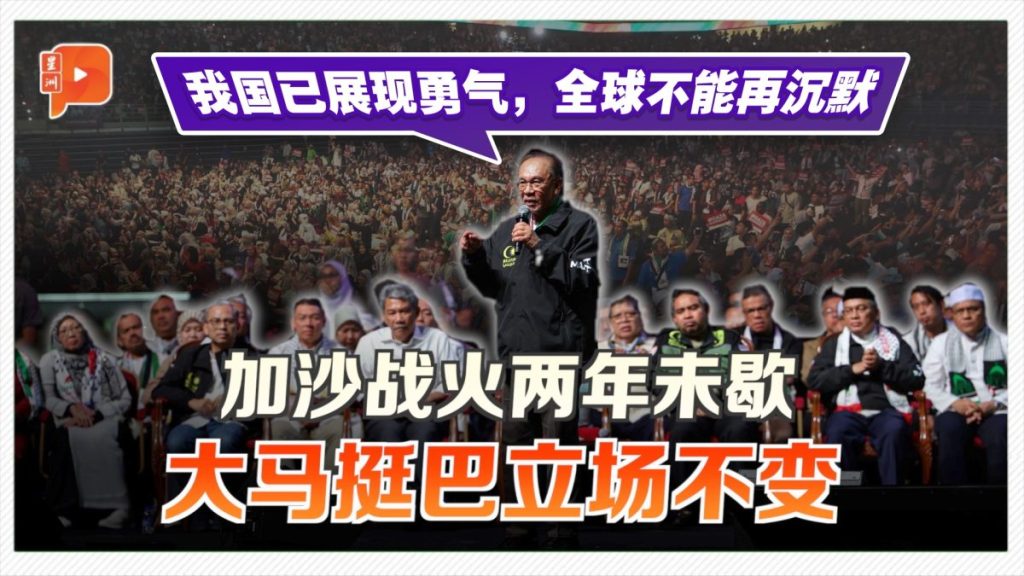 “马来西亚已展现勇气,全球不能默不吭声。” 加沙战事至今年10月7日已持续两年,新一轮停火和谈在埃及展开之际,首相安华及多位内阁成员10月8日晚上出席了“声援加沙人民集会”(Himpunan Solidariti Bersama Gaza)。 这场集会除了表达对巴勒斯坦人民斗争的支持,也向近日参与“全球坚韧船队”(GSF)人道任务的志愿者致敬。有者在台上分享经历时难掩情绪,不禁哽咽。