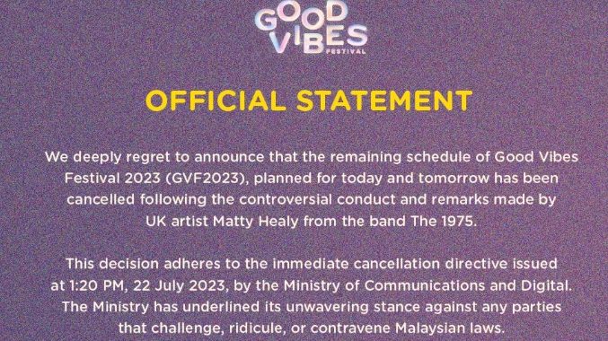数字通讯部长法米说,英国著名乐团The 1975来马演唱时,因主唱马修希利(Matty Healy)在台上亲吻男贝斯手,并大谈LGBT权利,已经违反海外艺人表演与电影播放中心委员会(PUSPAL)的现有指南,因此下令立即停办2023年“Good Vibes Festival”音乐节。