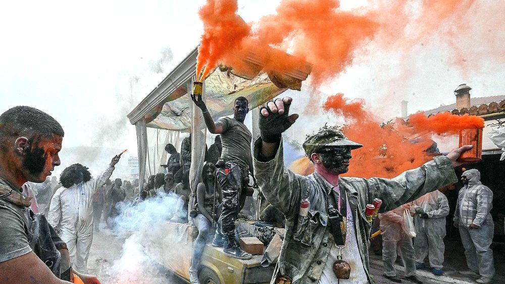 Revelers take part in a traditional "Flour War" marking the Clean Monday or Ash Monday in the town of Galaxidi in central Greece.