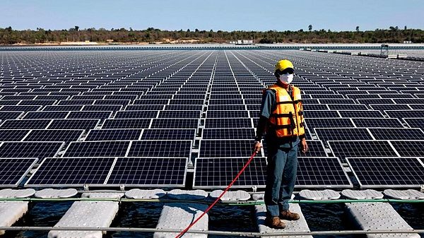 A vast array of solar panels floats on the shimmering waters of a reservoir in northeast Thailand, symbolizing the kingdom's drive towards clean energy as it seeks carbon neutrality by 2050.