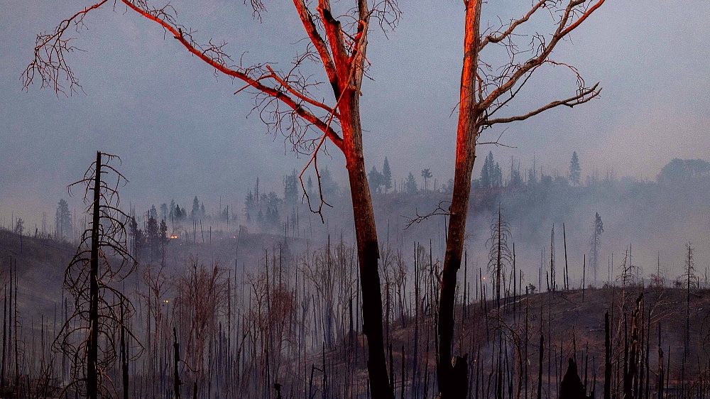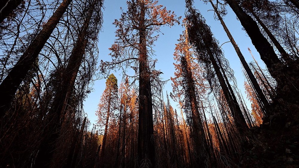 Giant sequoia trees scorched by the 2020 SQF Complex wildfire stand in Sequoia National Forest in California.