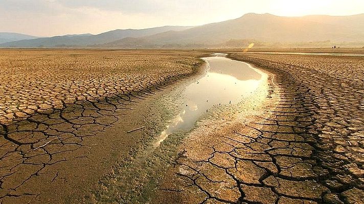 Part of the Guadiana River has dried up and gives way to dry land under the Puente de la Mesta medieval bridge in Villarta de los Montes, in the central-western Spanish region of Extremadura.