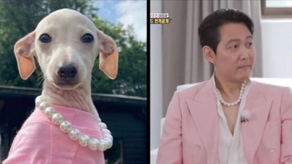 李政宰上节目当天身穿粉色西装和珍珠项链,有网民将李政宰的照片和网红狗做成对比图,画面引起全网热议。