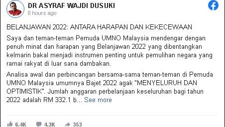 巫青团团长拿督阿斯拉夫形容,2022年财政预算案是掺杂着希望及失望的预算案,因为巫青团提出的数项人民诉求,如免息暂缓还贷得以实现,但仍有数项诉求没有被满足。