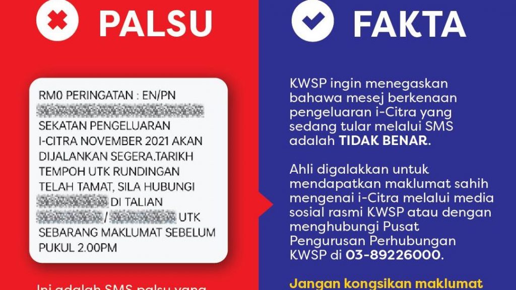 雇员公积金局(EPF)强调,该局没有透过手机简讯(SMS)发出有关i-Citra提款计划的资讯,网络流传的相关简讯内容不实,并促请民众保持警惕。