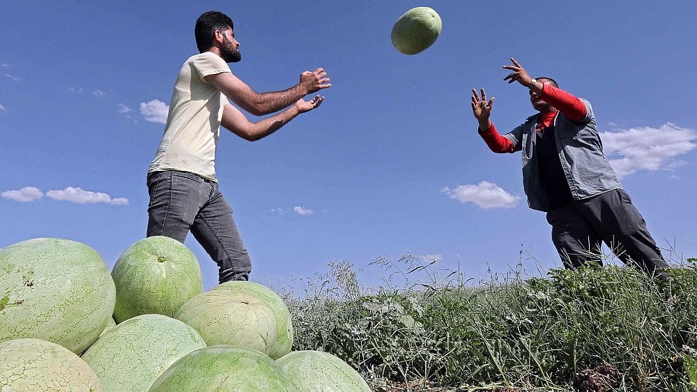 Kurdish farmers harvest watermelon at a field in the Bardarash district near the city of Dohuk in Iraq's autonomous Kurdish region.