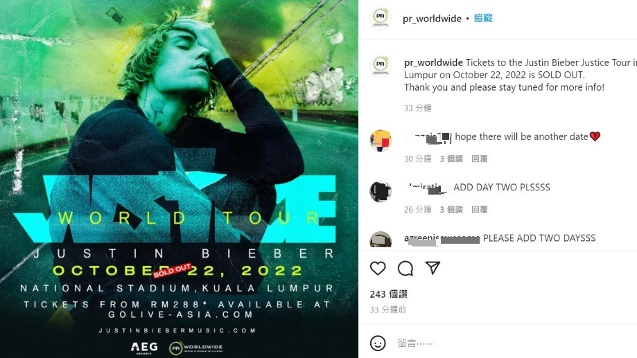 贾斯汀比柏(Justin Bieber)《Justice World Tour》大马演唱会门票今早11时开卖,主办单位在下午5时宣告全场完售。