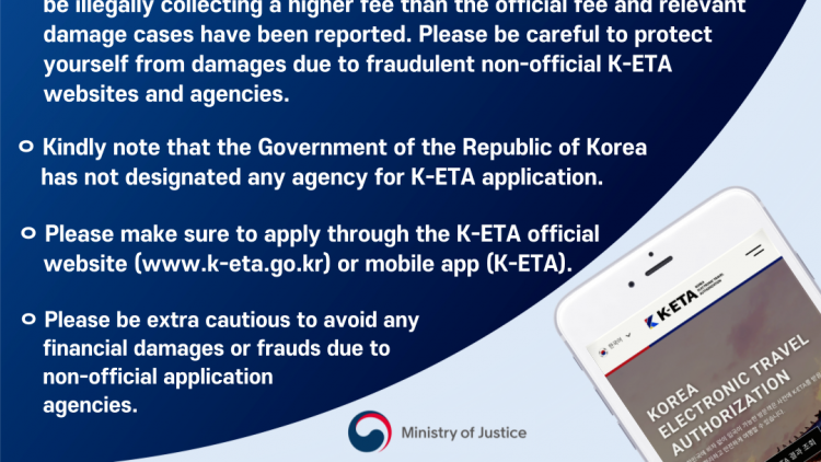 韩国法务部促请外国旅客,选择正式和官方渠道申请韩国电子旅行许可证(K-ETA),避免从非官方网站申请而造成损失。