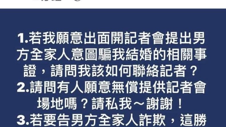 一名即将嫁给高雄男友的台北女子Kelly因为不满婚礼没有办在一桌2万台币(约2866令吉)的酒店而是办流水席,就在“匿名公社”脸书群组数落未婚夫一家是“乡下人”,结果遭到未婚夫妹妹以牙还牙!