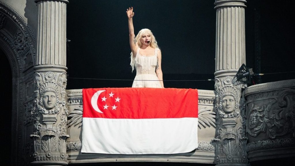 美国天后女神卡卡(Lady GaGa)于新加坡国家体育馆连开4场《Mayhem》演唱会,昨晚揭开首场序幕,首件红色舞台战衣特别添上一条白色绶带,之后又高挂新加坡国旗,向狮城致敬。她看着全场5万歌迷,还忍不住感动落泪。演唱会接近尾声之际,她更直接走下台,亲切地向粉丝问候、自拍,令全场疯狂。